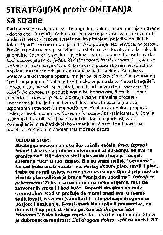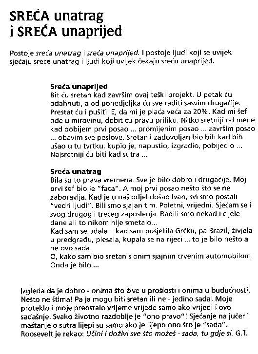 1. Strategijom protiv ometanja sa strane 2. Baratanje s predmetima 3. Sreća unatrag i sreća unaprijed 4. Izvucite pozitivno iz negativnog 5. Moć na poslu, u braku i politici 6. Kome još treba umjetnost ?
